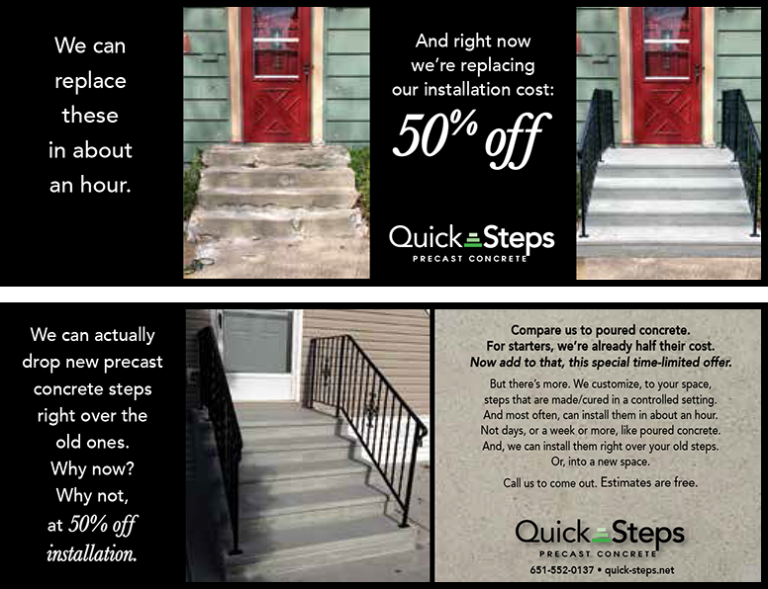 The product: precast concrete steps custom-made/cured offsite, delivered and installed. Compared to poured concrete onsite, precast is often half the cost and only takes hours to install versus days. But how to introduce these to customers and convince them to have them installed?