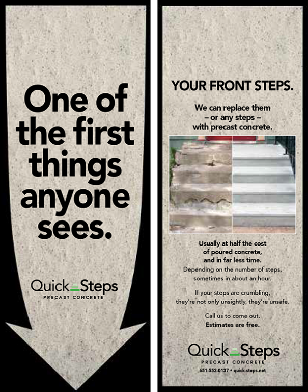 First things first. Name. Logo. Brochure. And QuickSteps was born. With a limited budget, I began with direct mail and door hangers, targeting specific zip-codes in the metro area. then geo-targeting even more specifically, homeowners, by household income and longevity in home.